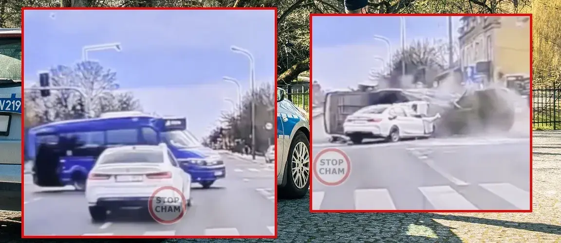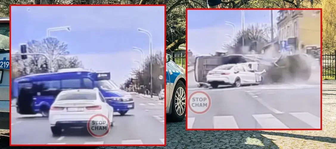 Wypadek miał miejsce w piątek. Na nagraniu, które teraz trafiło do mediów społecznościowych, widać, jak miejski bus skręca na skrzyżowaniu. W tym samym momencie wjeżdża na nie, z dużą prędkością, samochód marki BMW. Uderza w bok busa, który w efekcie tego zderzenia wywraca się na asfalt.