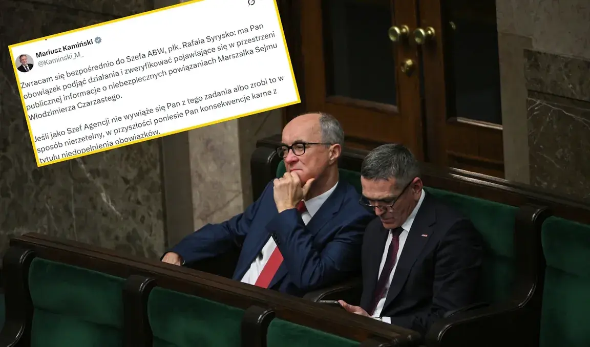 - Zwracam się bezpośrednio do Szefa ABW, płk. Rafała Syrysko: ma Pan obowiązek podjąć działania i zweryfikować pojawiające się w przestrzeni publicznej informacje o niebezpiecznych powiązaniach Marszałka Sejmu Włodzimierza Czarzastego. Jeśli jako Szef Agencji nie wywiąże się Pan z tego zadania albo zrobi to w sposób nierzetelny, w przyszłości poniesie Pan konsekwencje karne z tytułu niedopełnienia obowiązków - napisał Mariusz Kamiński.