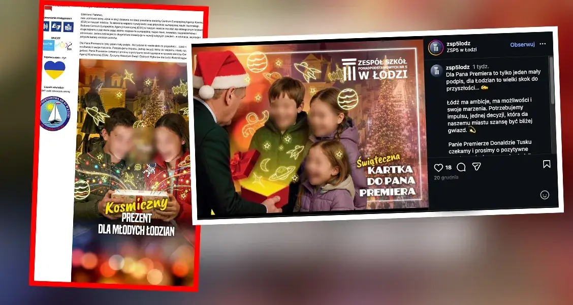 - (...) nasi uczniowie biorą udział w akcji działania na rzecz powstania siedziby Centrum Europejskiej Agencji Kosmicznej (ESA) w naszym mieście (...) dla Pana Premiera to tylko jeden mały podpis, dla Łodzian to wielki skok do przyszłości... Łódź ma ambicje, ma możliwości i swoje marzenia. Potrzebujemy impulsu, jednej decyzji, która da naszemu miastu szansę być bliżej gwiazd. Panie Premierze czekamy i prosimy o pozytywne rozstrzygnięcie w sprawie siedziby Centrum Europejskiej Agencji Kosmicznej (ESA). Życzymy Wesołych Świąt i Dobrych Wyborów dla Łodzi - czytamy na stronie szkoły podstawowej, w której zapoczątkowano akcję.