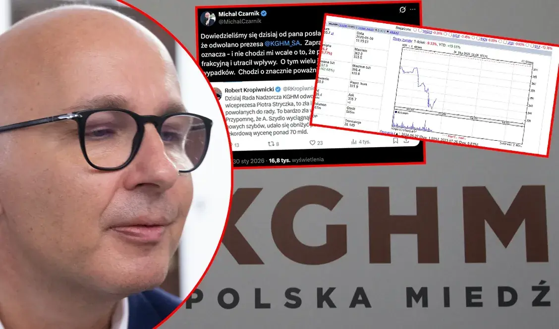 - W dniu 30 stycznia 2026 r. KGHM Polska Miedź S.A. opublikowała raport bieżący nr 9/2026 dotyczący zmian w składzie Zarządu Spółki (https://biznes.pap.pl/wiadomosci/firmy/kghm-polska-miedz-sa-92026-zmiany-w-skladzie-zarzadu-kghm-polska-miedz-sa). Jako podstawę prawną publikacji raportu Spółka wskazała art. 56 ust. 1 pkt 2 ustawy o ofercie publicznej (informacje bieżące i okresowe), a jako szczegółową podstawę prawną § 5 pkt 5 i 6 rozporządzenia Ministra Finansów z dnia 6 czerwca 2025 r. w sprawie informacji bieżących i okresowych, dotyczących odwołania i powołania członków zarządu emitenta. Art. 10 rozporządzenia MAR odnosi się do bezprawnego ujawnienia informacji poufnych, a nie do informacji bieżących. Spółka nie zakwalifikowała przekazanych informacji jako informacji poufnej. KNF analizuje komunikaty publikowane przez emitentów, a w przypadku powzięcia wątpliwości co do prawidłowego wykonywania przez nich obowiązków informacyjnych, jest uprawniona do podejmowania czynności nadzorczych, w tym m.in. do żądania od emitentów stosownych wyjaśnień oraz dokumentów. W piątek kurs akcji KGHM Polska Miedź S.A. spada o około 9%, przy jednocześnie podwyższonym poziomie obrotów. Na notowania Spółki wpływ mogą mieć czynniki rynkowe, w szczególności spadki cen surowców na rynkach światowych: https://biznes.pap.pl/wiadomosci/firmy/dzien-na-gpw-glowne-indeksy-przewaznie-spadaja-kghm-najslabsza-spolka-na-gpw - czytamy w przesłanym do nas oświadczeniu.