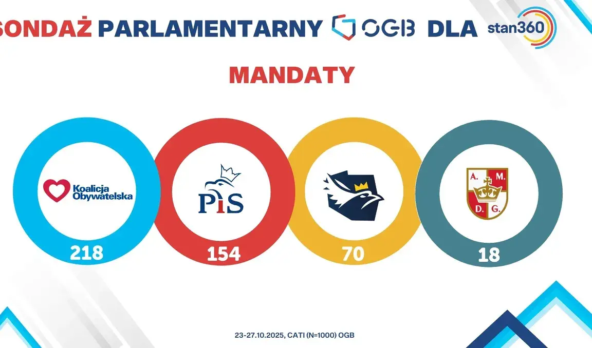 Z wyliczeń OGB wynika, że PiS, Konfederacja oraz Konfederacja Korony Polskiej Grzegorza Brauna łącznie zdobyłyby ponad 50 proc. głosów i 242 mandaty w Sejmie. To oznaczałoby możliwość stworzenia rządu, który zakończyłby rządy obecnej koalicji Donalda Tuska.
