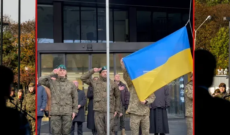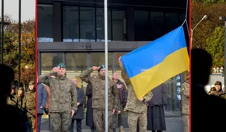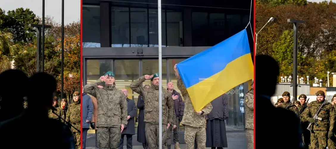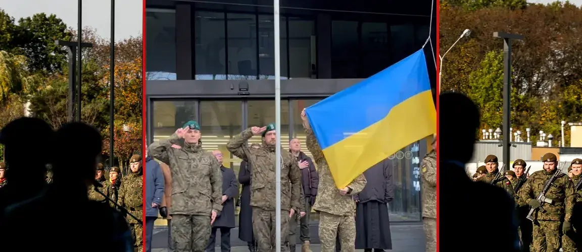 Na nagraniu, o którym mowa, widać jak na maszt wciągana jest przez dwóch ukraińskich żołnierzy flaga Ukrainy, a z głośników rozlega się hymn tego państwa. Stojący obok polscy żołnierze salutują.