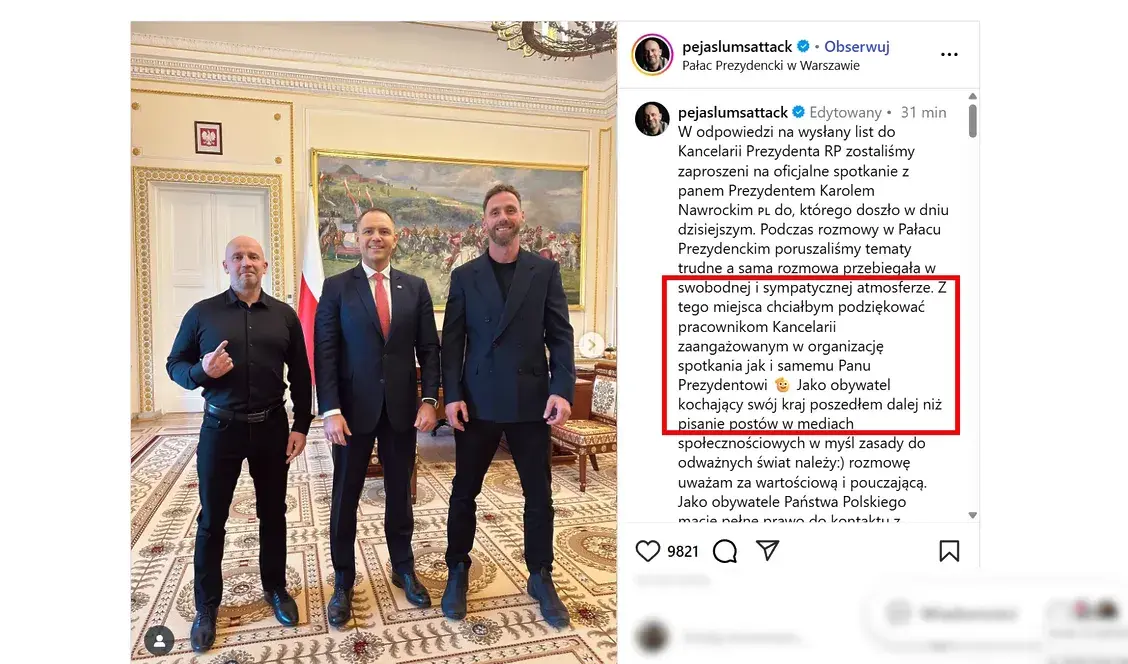 – W odpowiedzi na wysłany list do Kancelarii Prezydenta RP zostaliśmy zaproszeni na oficjalne spotkanie z panem Prezydentem Karolem Nawrockim. Podczas rozmowy w Pałacu Prezydenckim poruszaliśmy tematy trudne, a sama rozmowa przebiegała w swobodnej i sympatycznej atmosferze – napisał artysta na Instagramie.